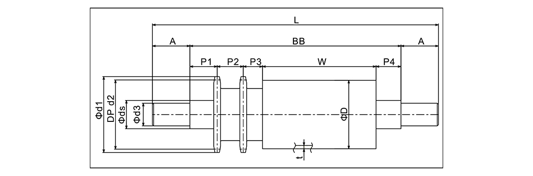 | Tip | Veličina valjka | Širina | Matenal | Nosač | Promjer osovine | Zupčanik | D1 | d2 | d3 | A | L | BBB | P1 | P2 | P3 | P4 |